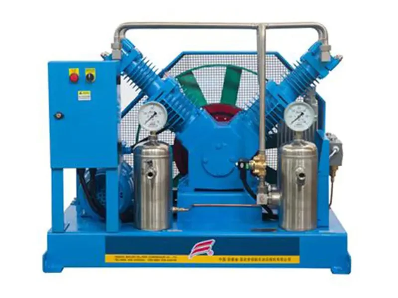 El compresor o booster de oxígeno sin aceite cumple con los estándares de limpieza de oxígeno. Todos los componentes en contacto con el gas se someten a una limpieza exhaustiva con documentación completa. Esta configuración funciona sin aceite lubricante y utiliza juntas de estanqueidad. Su funcionamiento a baja velocidad, combinado con aros de pistón de larga duración, garantiza la durabilidad y previene la contaminación por oxígeno.