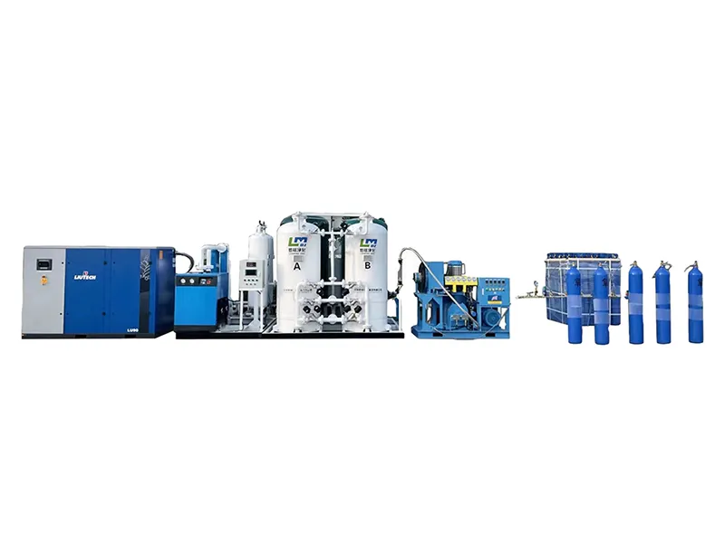 Para regiones o países donde el suministro local de cilindros de oxígeno es inaccesible y los costos de transporte son elevados, LuoMing ofrece una estación de llenado de cilindros de oxígeno in situ con gran adaptabilidad. En combinación con generadores de oxígeno, esta estación satisface la demanda de oxígeno industrial, médico o residencial in situ, permitiendo además el llenado del excedente en cilindros para su almacenamiento y distribución externa. Este enfoque reduce la dependencia de la logística tradicional de suministro de oxígeno y mejora la eficiencia en la utilización de recursos, proporcionando una solución económica y sostenible para el suministro de oxígeno in situ y la generación de ingresos.