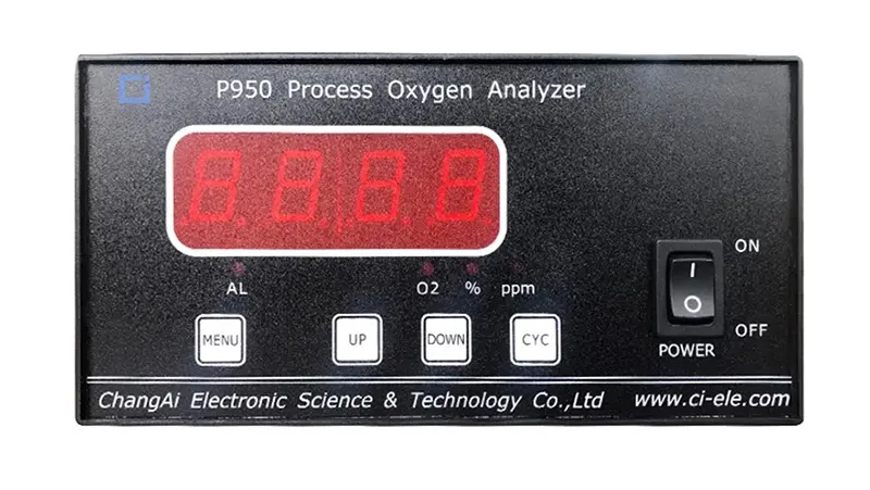 El analizador de oxígeno P950, basado en microprocesador, utiliza un sensor de oxígeno de corriente iónica como elemento de medición. Tras el procesamiento y cálculo de la señal, se muestra la concentración de oxígeno en la mezcla de oxígeno y nitrógeno. Las configuraciones incluyen puntos de ajuste de alarma, señales de salida analógicas y salidas de conmutación para la integración del usuario.
